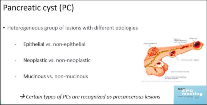 Problématique justifiant la recherche ou l’étude : Les kystes pancréatiques (KP) sont un groupe hétérogène de lésions aux différentes étiologies, certains de ces KP pouvant être des lésions pré-cancéreuses. Leur incidence est en augmentation et leur prévalence augmente de façon exponentielle avec l’âge. Il est donc important d’arriver à sélectionner des facteurs de risque prédictifs d’évolution néoplasique dans les KP pré cancéreux. Les facteurs de risque connus sont pour les plus fréquents : l’âge, les CaPaFa, les apparentés de PDAC au premier degré, les antécédents de PCC, la présence de mutations génétiques. Ces facteurs prédisposants sont pour la plupart inévitables. Il semblerait que l’inflammation puisse aussi être un facteur de risque de KP. Le diabète et ses complications pouvant être une cause d’inflammation et de stress métabolique pancréatique, il paraissait intéressant de rechercher l’influence de cette pathologie sur les KP.