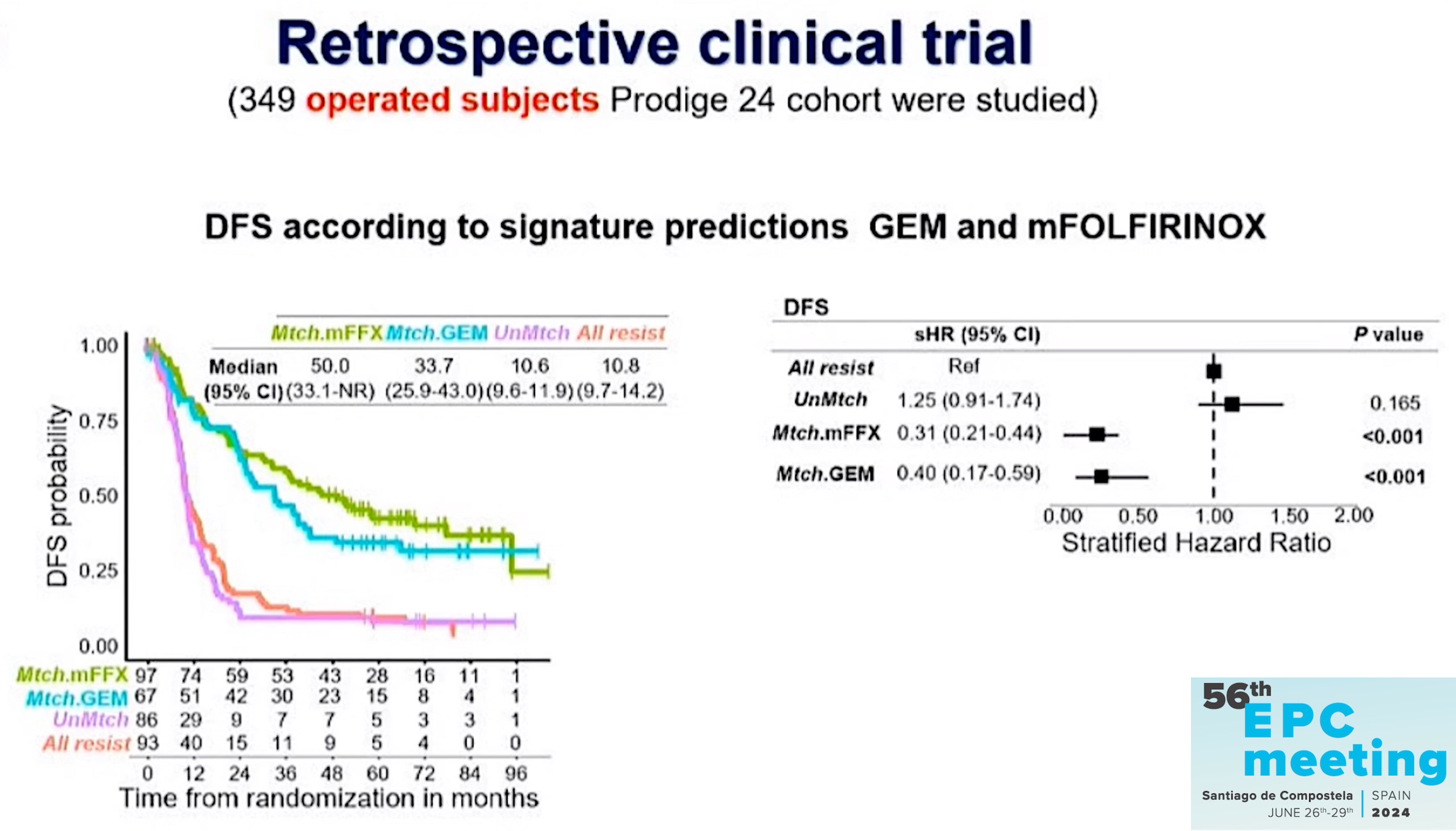 Matériels et méthodes : Signatures transcriptomiques assistées par intelligence artificielle développées à partir de lignées cellulaires (n>50), d’organoïdes (n>250) et de xénogreffes (n>150) puis validée et évaluée chez 349 patients inclus dans l’étude PRODIGE 24 (chimiothérapie adjuvante par FOLFIRINOX vs. Gemcitabine chez les patients opérés d’un cancer pancréatique).