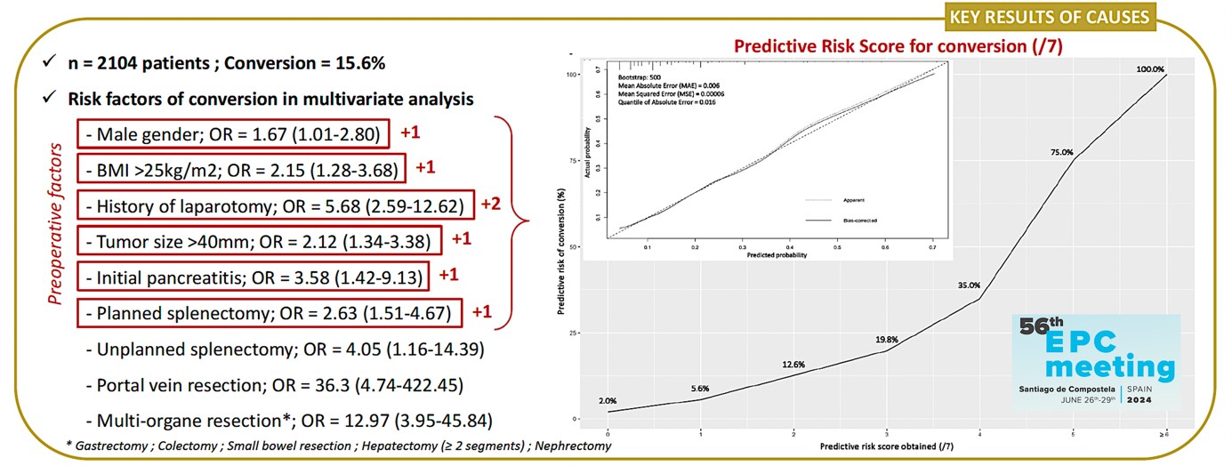Résultats : Au total 2104 patients ont été inclus, parmi lesquels le taux de conversion était de 15,6%. Les 6 facteurs de risque de conversion indépendants étaient le sexe masculin, le surpoids, un antécédent de laparotomie, une taille tumorale > 4 cm, une pancréatite initiale et la réalisation d’une splénectomie prévue. Le modèle obtenu permettait une prédiction significative, avec un risque de conversion de 20%, 35%, 75% et 100% en présence de 3, 4, 5 ou 6 facteurs de risque. Après ajustement sur un score de propension, la conversion était associée à une augmentation de 80% du risque de complications sévères (22,4% vs. 17,3% ; OR 1,80 [1,16-2,54], p=0,009).