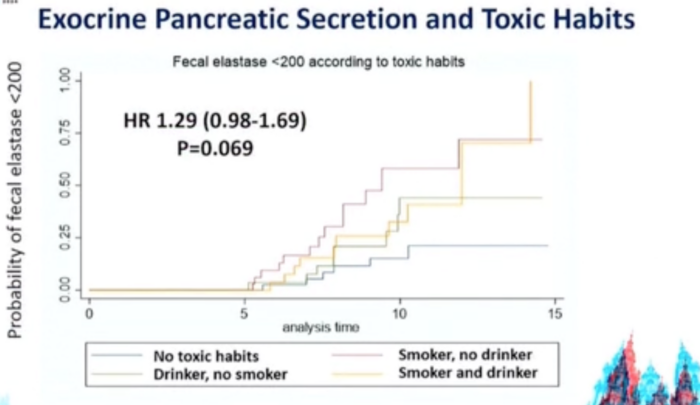 Résultats : 136 patients ont été inclus, 65 % d’hommes avec une moyenne d’âge de 56 +/- 13 ans. Le suivi médian était de 9 ans (5-15 ans). A l’inclusion, 41 % des patients étaient fumeurs et consommateurs d’alcool, 43 % uniquement fumeurs et 17 % uniquement buveurs. A la fin du suivi, seuls 34 % étaient abstinents, 24 % continuaient uniquement le tabac, 21 % l’alcool, et 20 % consommaient encore les deux toxiques. A l’inclusion, ils avaient tous une élastase fécale normale, mais à la fin du suivi, 27 % avaient une élastase < 200 et 7% <100. La probabilité de développer une IPE était plus importante chez les patients continuant leur intoxication, particulièrement les fumeurs et fumeurs + buveurs. En analyse multivariée, la consommation de tabac +/- alcool était associée à une IPE. L’évolution vers une IPE était aussi corrélée à la progression morphologique des lésions à l’EUS. Il n’y avait par contre pas de différence dans le nombre de patients diabétiques à l’inclusion et en fin de suivi.