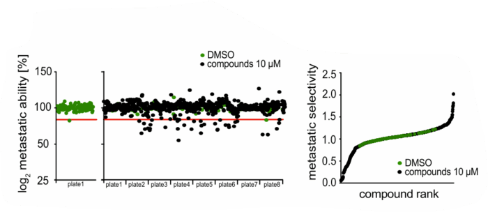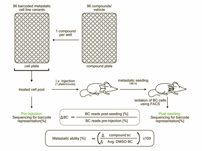 Une centaine de pool de cellules est transduite à l’aide d’un lentivirus qui permet d’insérer un code barre spécifique à chaque pool, au niveau de leur ADN. Cette lignée cellulaire murine (0688M), qui est issue de métastases hépatiques de PDAC dérivée du modèle murin KRasLSL-G12D/+;p53LSL-R172H/+;Pdx1-Cre, a été choisie car elle est dotée d’un fort potentiel métastatique. Chaque population cellulaire, possédant chacune un code bar unique, a été traitée avec un inhibiteur irréversible spécifique (712 au total répartis sur des plaques 96 puits). Les populations cellulaires ont alors été mélangées puis injectées dans la veine caudale de souris receveuses. 48h après, le foie et les poumons ont été récupérés et dissociés afin d’isoler les cellules métastatiques (Figure 1). Un séquençage des populations cellulaires avant et après passage chez la souris a permis d’identifier les populations cellulaires qui ont vu leur potentiel métastatique diminué (ou augmenté) par le traitement (Figure 2).
