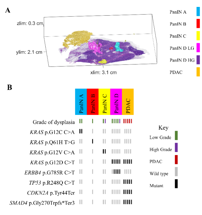 Figure 2 : Modèle 3D d’un tissu pancréatique grossièrement normal montrant de multiples PanINs spatialement distinctes, chacune représentée par des couleurs uniques (A). Tableau des mutations avec les résultats du séquençage ciblé, où chaque colonne correspond à une lésion spatialement distincte, et dont les couleurs des lésions correspondant au modèle 3D (B).