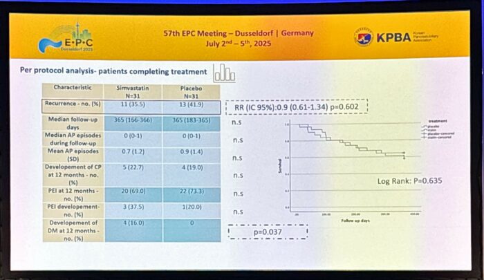 Résultats : 23 centres participaient à l’étude. 85 patients au final étaient inclus. En ITT, il n’y avait pas de différence significative en terme de récidive (RR(IC95% : 1.03(0.7-1.56) p=0.88) avec un taux de récidives de 46.2% dans le groupe Simvastatine vs 44.4% pour le placebo. En analyse per protocole chez les patients ayant pris tout leur traitement, la différence n’était pas significative non plus et on notait un taux de diabète à 12 mois plus élevé dans le groupe simvastatine (16% vs 0, p=0.037). L’étude était arrêtée devant l’absence d’effet de la simvastatine.